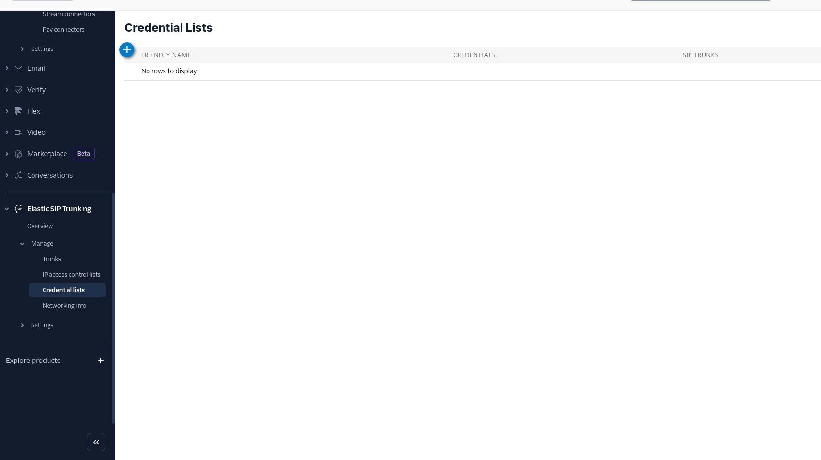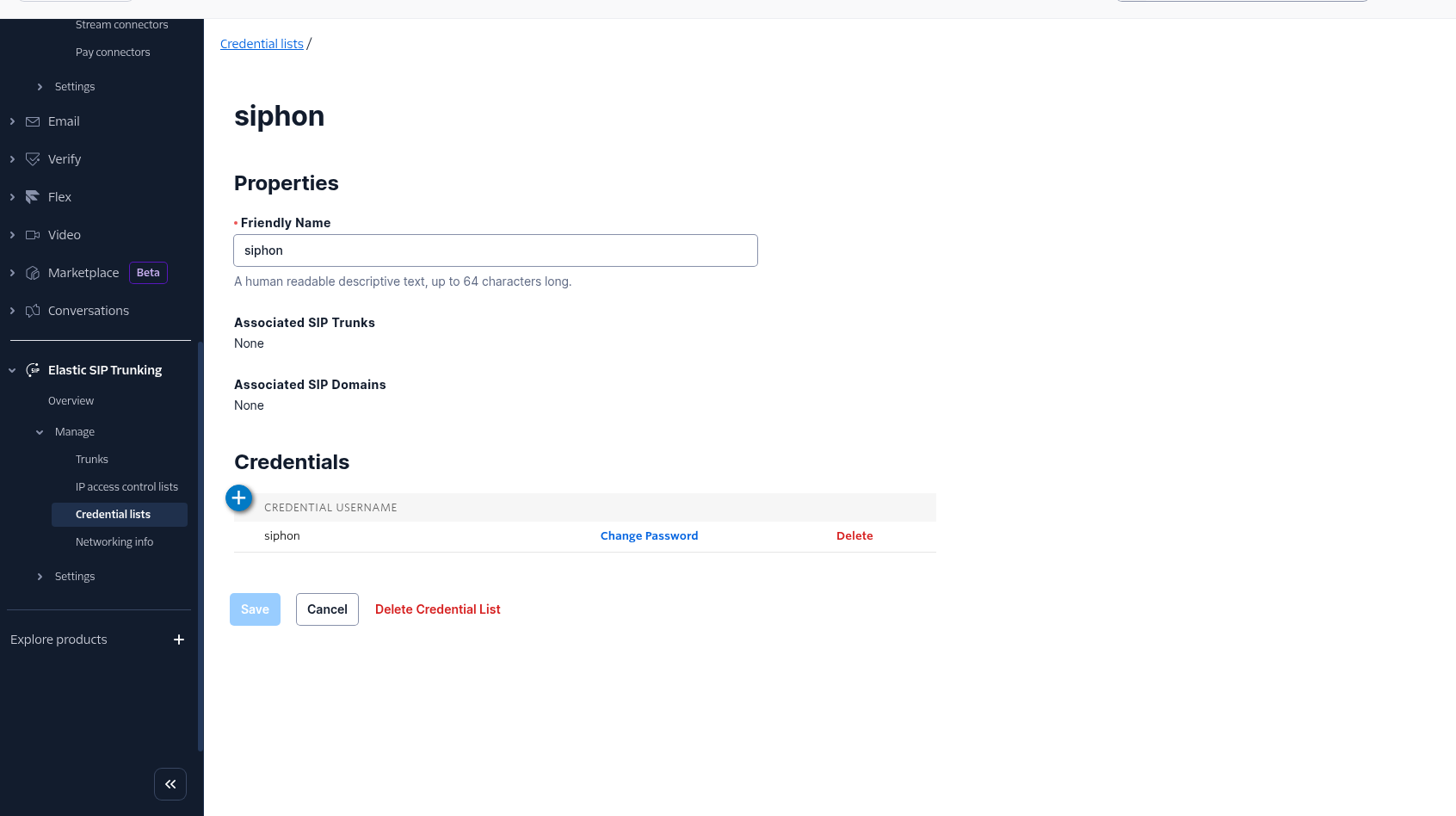 - Elastic SIP Trunking -> Manage -> Credential lists