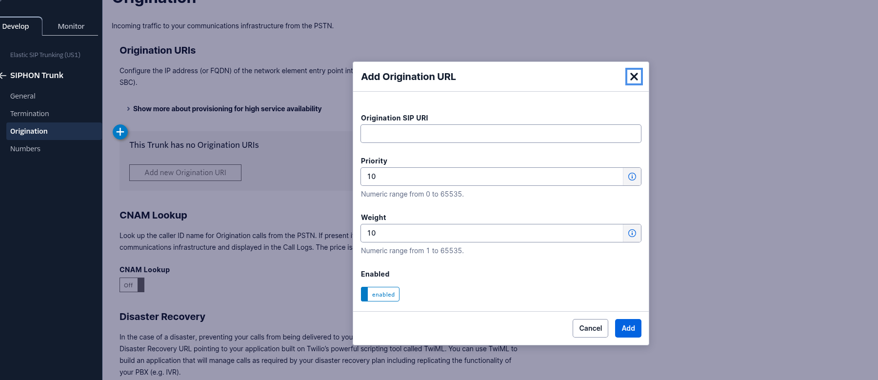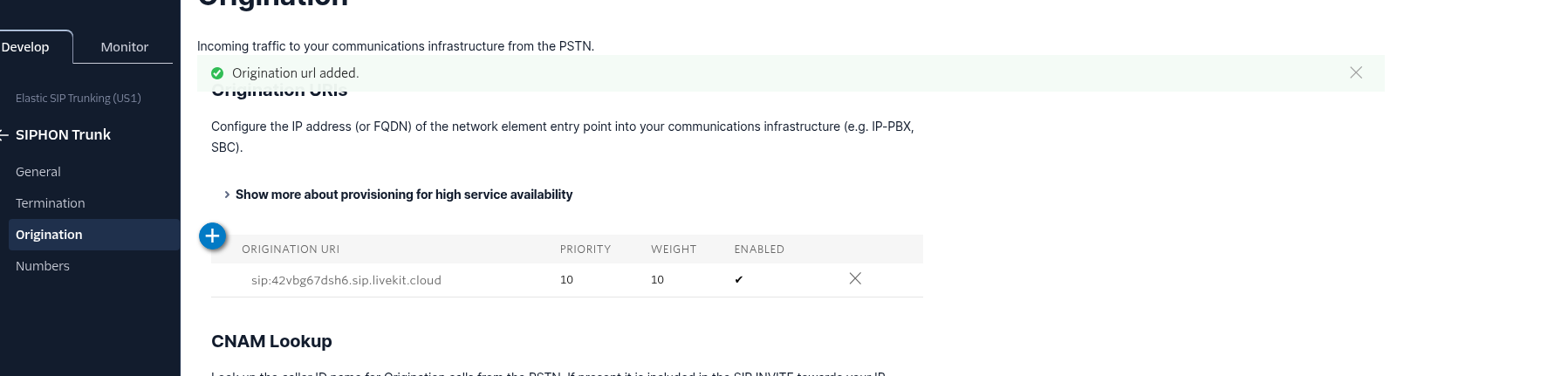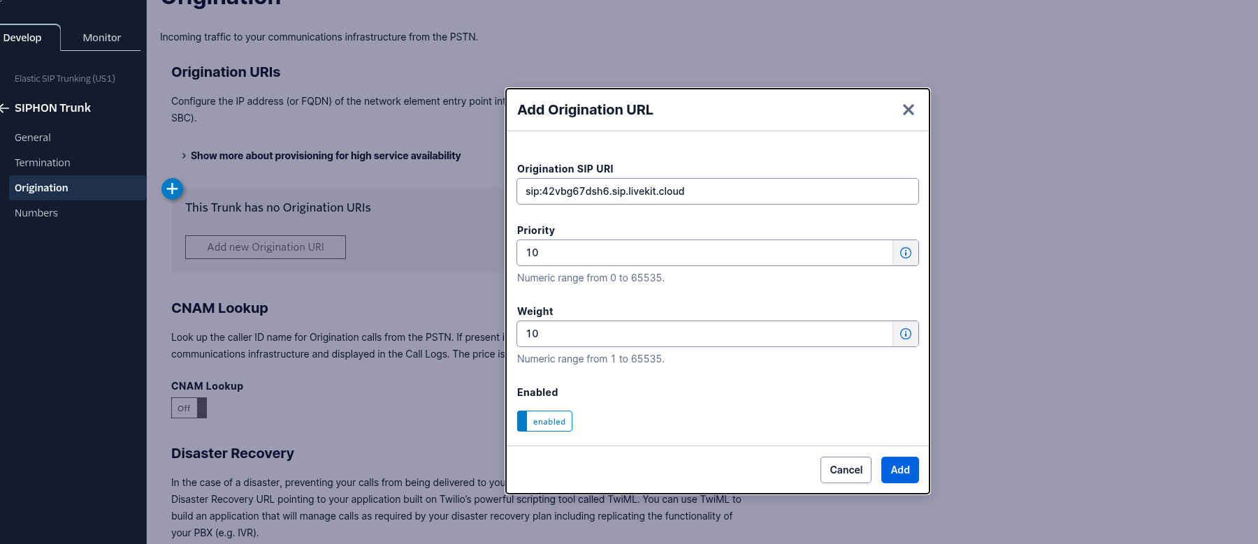 Set Origination SIP URI to your LiveKit project’s SIP endpoint (the SIP URI shown in your project settings - on cloud).