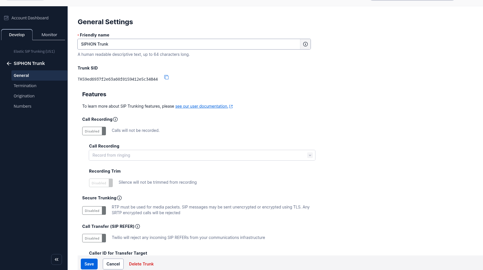 SIPHON Trunk - Domain: Twilio will create a domain that ends with